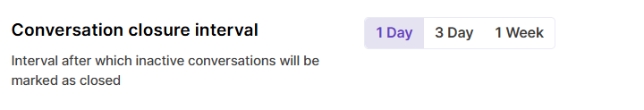 This parameter controls time period after which conversations with the Agent are automatically closed and post-processed. Default value is 1 day, but intervals of 3 days and 1 week are also available. Conversation closure and post-processing are handled by a regular job run.