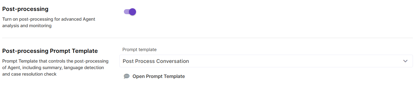 Enable post-processing to collect metrics about conversations, like user sentiment, language, or resolution status. Metrics are generated with the help of a post-processing Prompt Template, for example DEFAULT_AGENT_POST_PROCESSING.