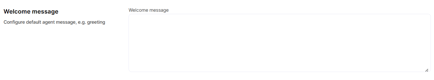 A field to provide a default welcome message for the end-users. This message remains on UI and does not become a part of Agent's conversation (i.e. you will not be able to see it in Traces etc).
