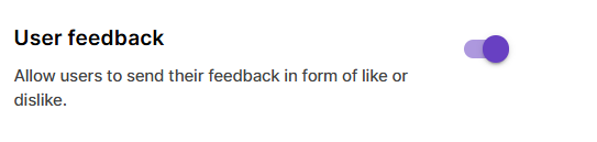 Enable user feedback to collect likes and dislikes. For negative feedback, a comment can also be provided, so that Agent owners can analyze feedback. User likes and dislikes are included in Usage reports on both message and conversation level.