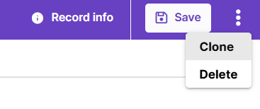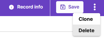To delete a record, click the three-dot icon in the top right corner of the screen, next to the Save button, and select Delete. Then, confirm your action in the pop-up.