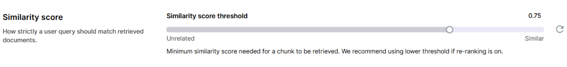 Similarity score threshold indicates the minimum similarity score that is required for a chunk to be retrieved. A higher score (like 0.9) means that the match between chunk meaning and user input meaning must be very high. A lower score means that less relevant chunks may be retrieved. Default value is 0.75, which is a moderate similarity score.
