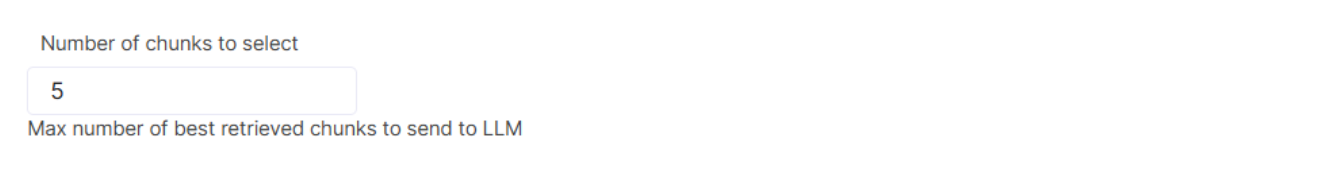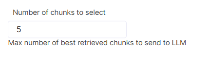 This parameter controls how many chunks are selected and passed to the LLM for generation if there are multiple chunks with score that fits the threshold. For example, with default Similarity score threshold value of 0.75, if there are 10 chunks with score above 0.75 and Number of chunks to select is set to 5, only 5 top chunks will be sent to the LLM for answer generation. If there are 3 chunks with score above 0.75, only these three will be passed to the LLM.