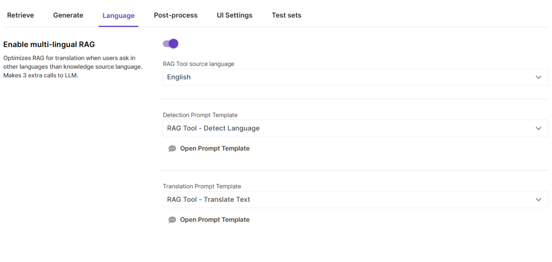 The Multi-lingual RAG flow works by detecting user question language, translating the query into the language of Knowledge Source and, after response has been generated, translating it back into user’s language. This approach makes additional calls to LLM, but it significantly improves the quality of multi-lingual RAG.