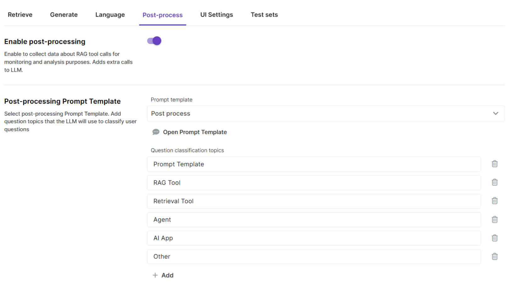 The Post-processing Prompt Template provides instructions on how to extract these specific metrics from a RAG response, so normally there is no need to edit or replace it. Make sure you manually add some Topics to classify your user questions - these are configured on the RAG tool level.