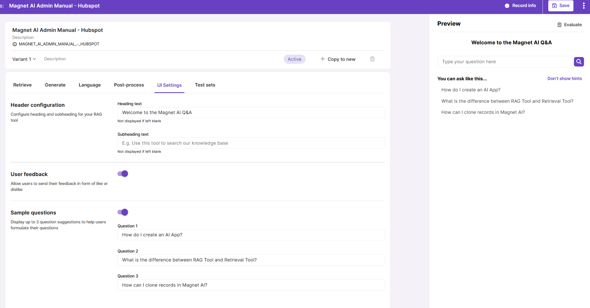 UI Settings provide additional customization options for end-user experience, such as heading and subheading and sample questions that give users a hint on what kind of questions they can ask. Here you can also enable user feedback to collect likes and dislikes. Changes that you make are immediately available in the Preview area.