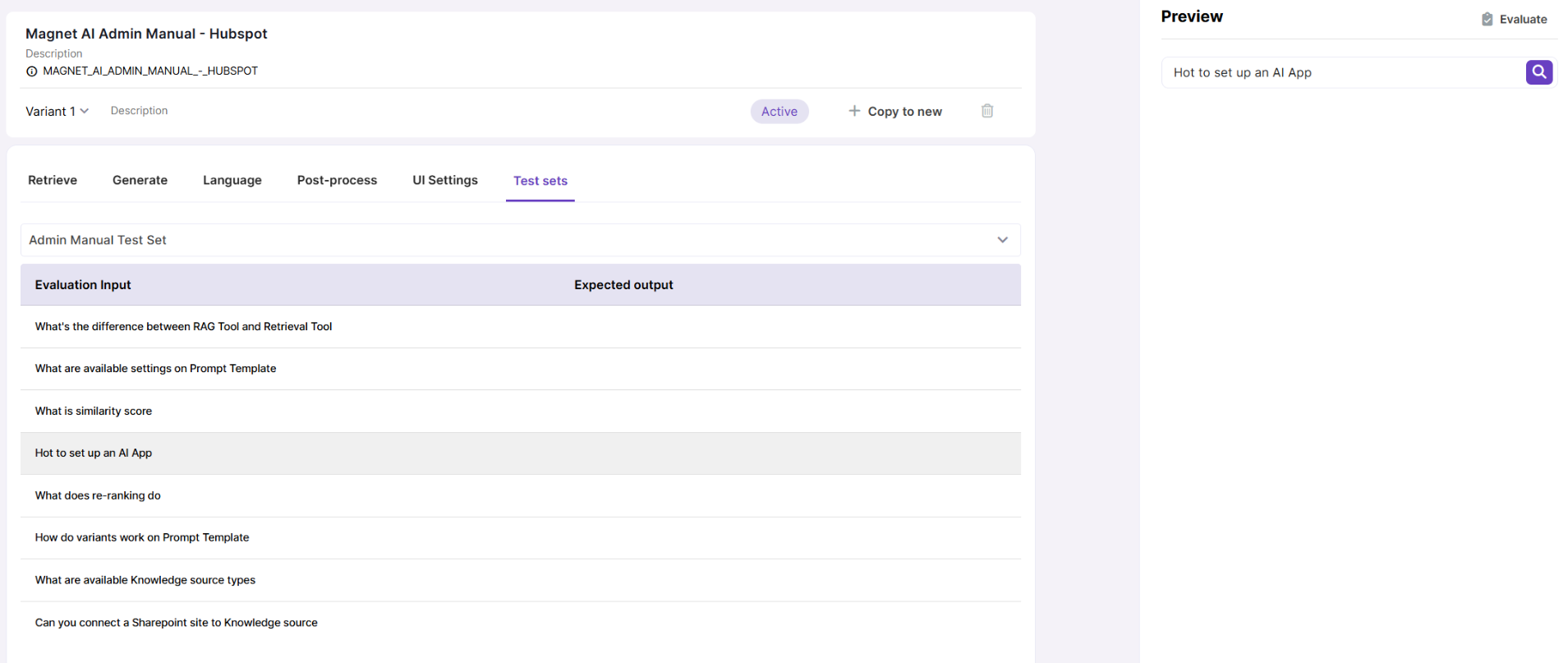 Under the Test sets tab, you can select the most relevant or frequently used Test set with test records for the RAG Tool. This speeds up testing of the RAG Tool: just pick a record and it immediately gets copied into the Preview area.