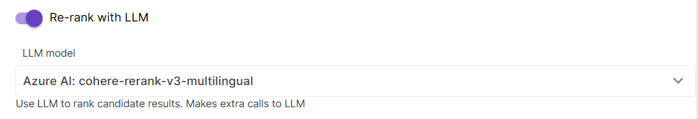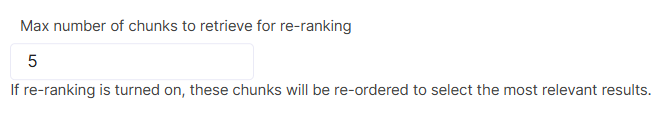 If Re-ranking is enabled, it is recommended to set a lower similarity score threshold, because at the first step we need to grab a wider range of chunks for further re-ranking. Also, if this technique is enabled, you have an additional parameter under the Chunk limits: Max number of chunks to retrieve for re-ranking . This controls how many chunks will actually get re-ranked. Default value is 5. Other Chunk limits also remain applicable if Re-ranking is enabled.