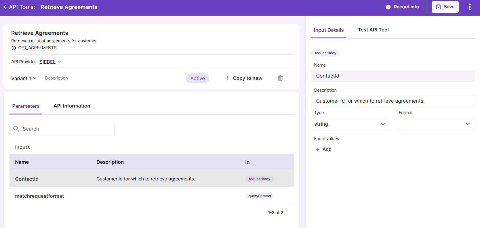 Click on an input parameter on the API Tool details screen to view its details like name, description, type, format and enum values. You can adjust these values if necessary.