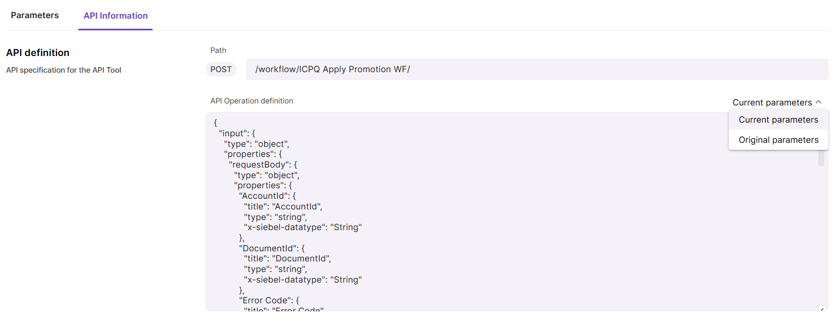 The API information tab allows user to check API Tool definition in JSON format. It displays current definition, but there is also an option to view original definition generated from the uploaded spec file.