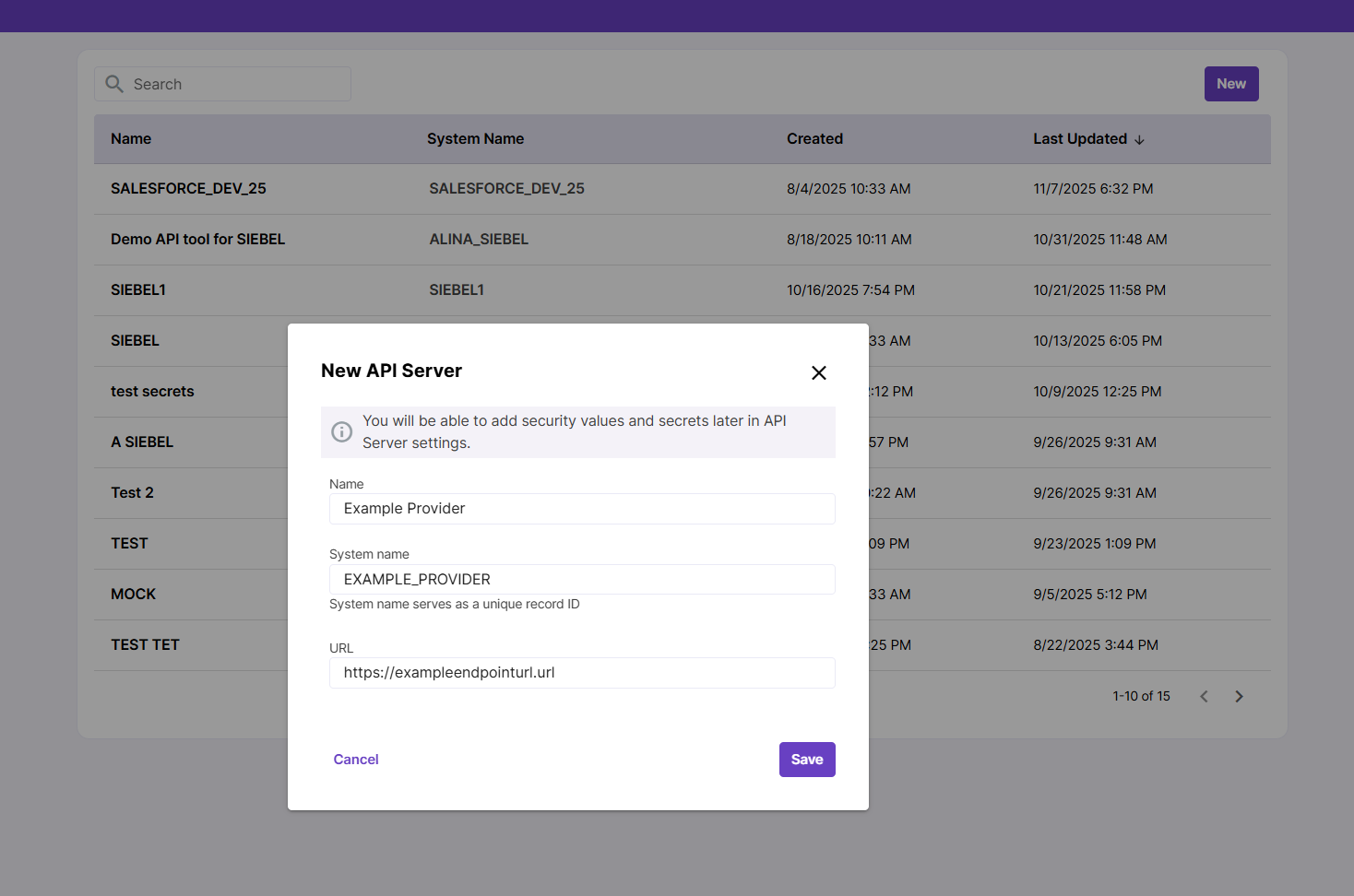 You will be prompted to fill in API provider name (make sure it is informative and clear) and endpoint URL, which cannot be changed later.