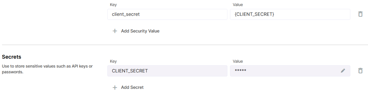 {PLACEHOLDER}and store secrets in theSecretssection.Secrets is the right place to store sensitive values like API keys, passwords, and tokens. Secrets are encrypted and stored securely, so you will not be able to view them after saving.