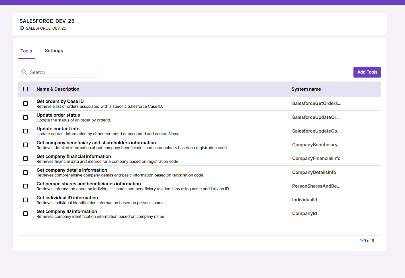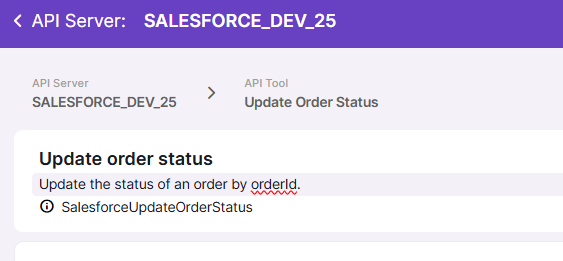 To view and adjust an API Tool settings, click on an API Tool record. Configuring API Tools involves adding descriptions for input parameters, if these are missing in initial specification. This is important because when API Tools are provided to Agents in form of Actions, the LLM needs to understand the purpose and structure of each API Tool in order to effectively process user queries.