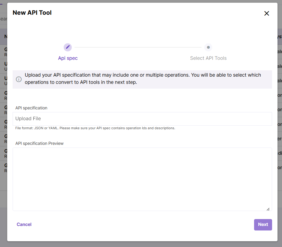 Your API specification can be in JSON or YAML format and can include one or multiple operations. Make sure that the file contains operation Ids as these will be used for API Tool creation, as well as operation descriptions and, ideally, parameter descriptions.