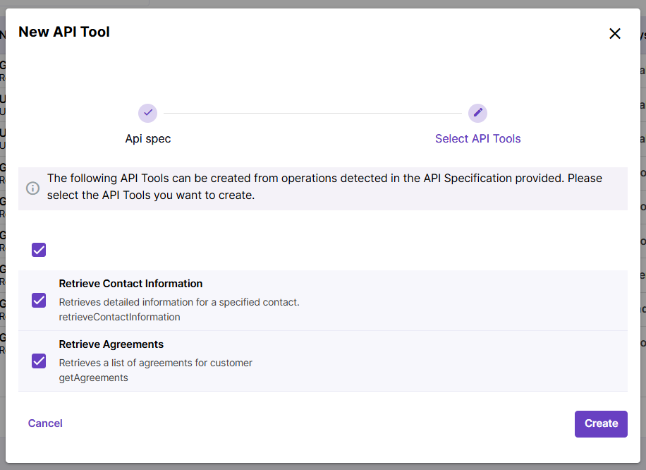 At the next step, you will be prompted to select which operations you are willing to transform into API Tools. All detected operations are marked by default.