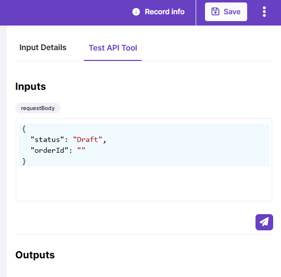 Click the Test API Tool in the right panel of the screen to preview your API Tool. In some cases, example inputs are pre-populated to simplify testing. You can also paste your JSON with test inputs here. Click the Send button to test the API Tool response.