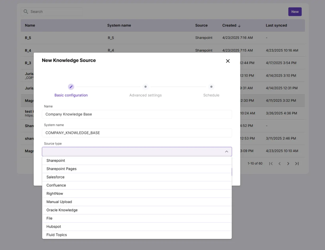 Knowledge source types available for your organization depend on your setup and are configured on the backend. As an admin, you’ll see all configured types listed in the dropdown menu when creating a new Knowledge Source.
