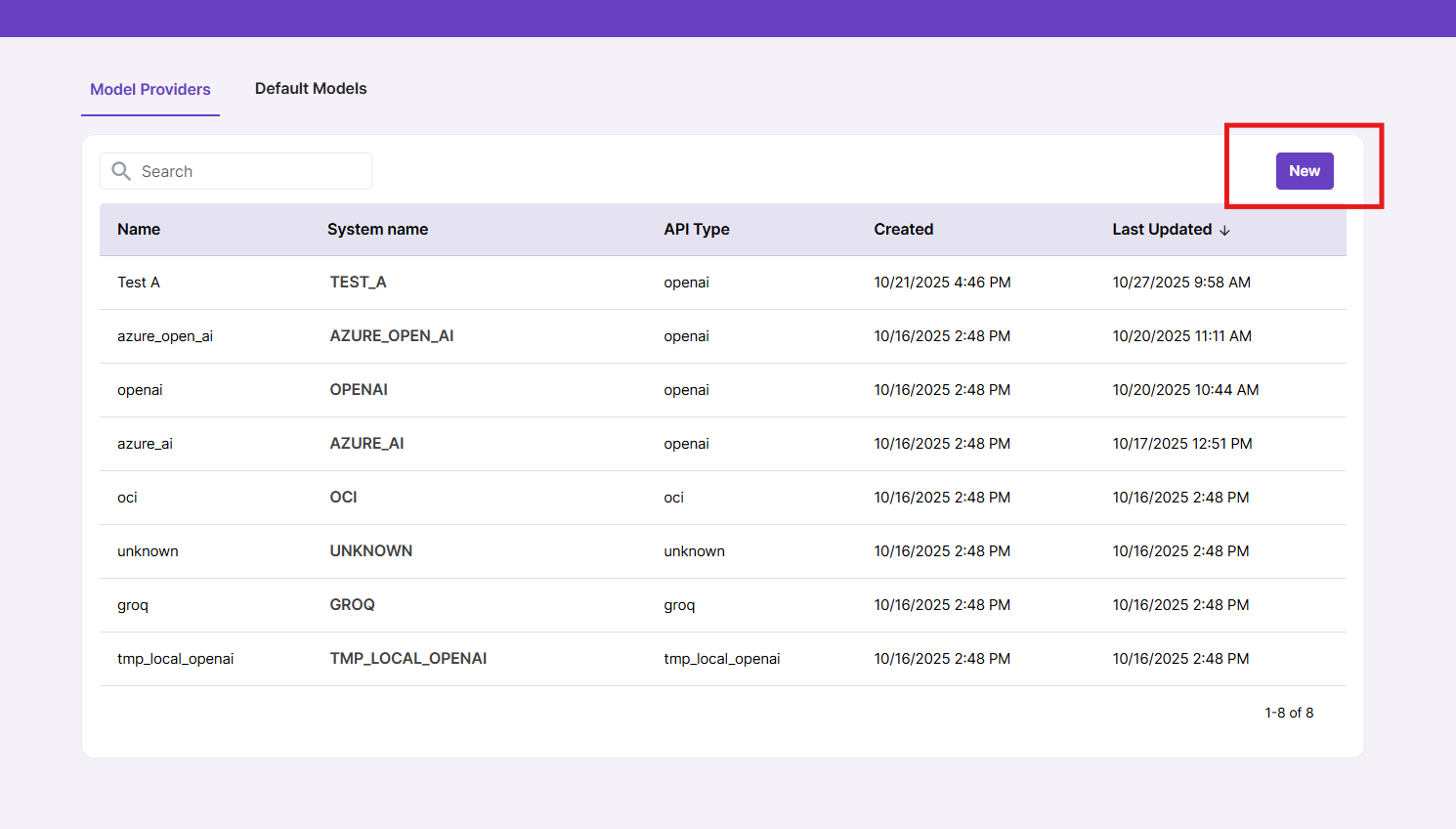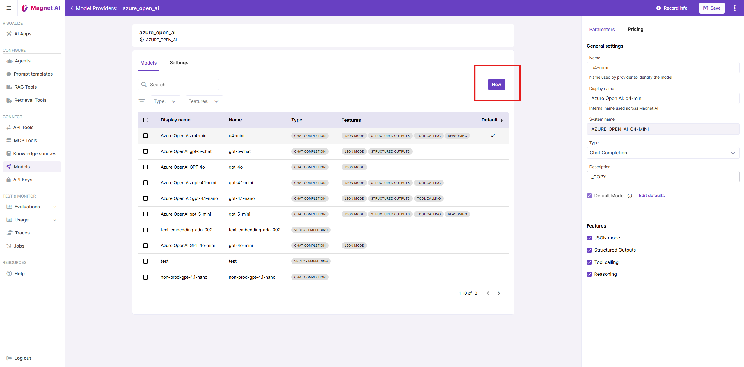 To add a Model Provider, navigate to Models in main navigation and click New.