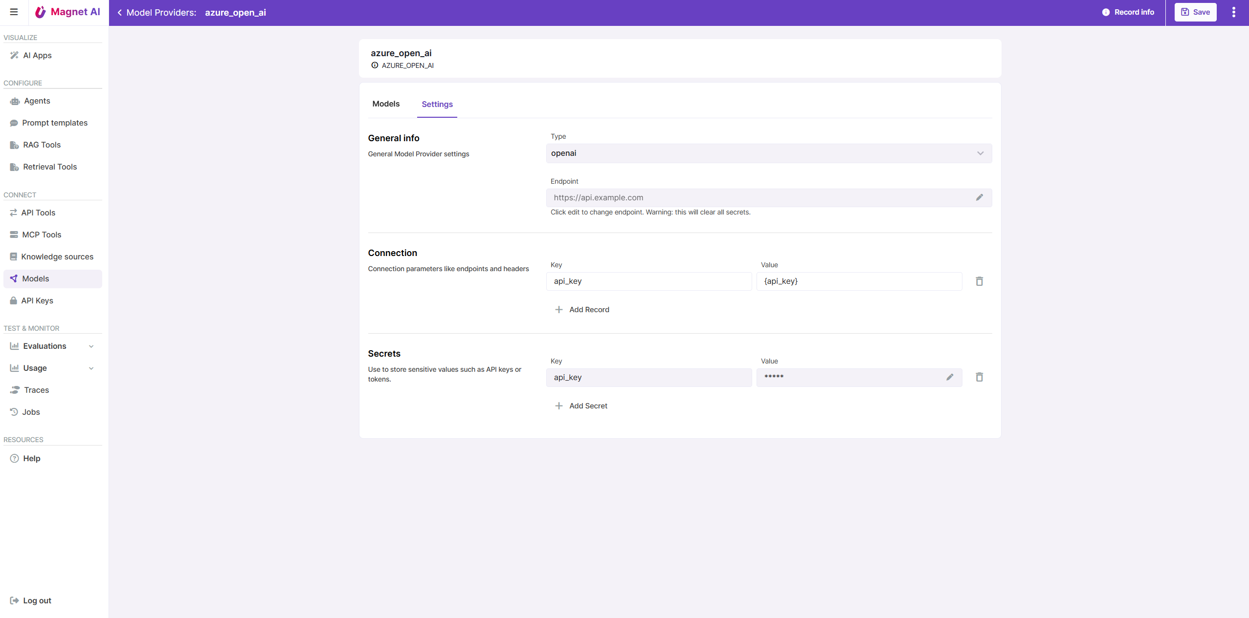 Note: If you happen to change the endpoint URL on an existing Model Provider, all secrets will get cleared.