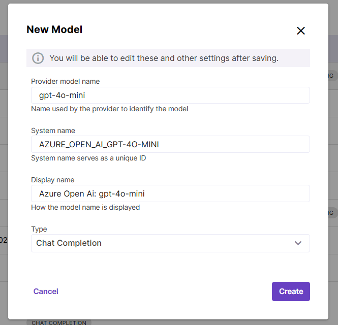 Display name field will be automatically populated from Model Provider name + Model name, but you can manually edit it if necessary.