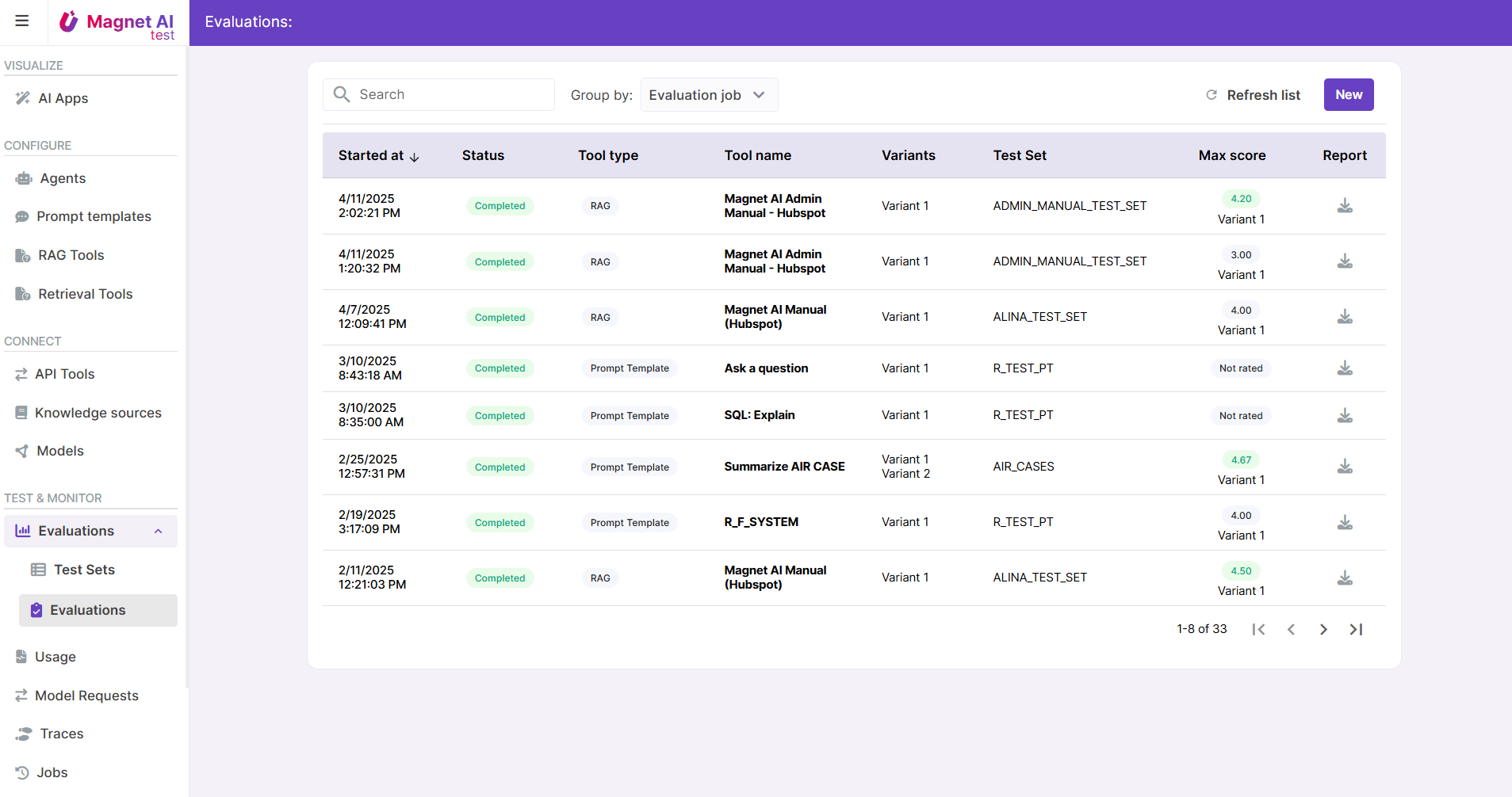 Currently only human evaluation is supported by Magnet AI, with automated scoring planned for future release. Evaluations are supported for Prompt Templates and RAG Tools.